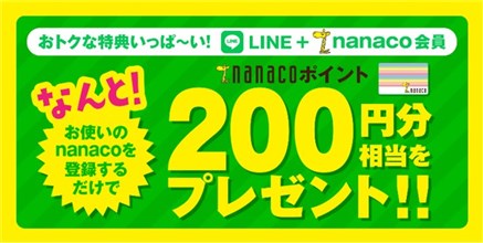 キャンペーン終了までの期間内に、公式LINEアカウントを友だちに追加をして、トーク画面からnanacoを登録をすると、後日全員が『nanacoポイント 200円分相当』を貰える、プレゼントキャンペーンとなっています。※キャンペーンの終了日時は不明です。