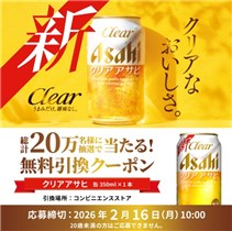 2026年2月16日(月)10時までのキャンペーン期間内に、特設ページにアクセスをした上で応募ボタンからアンケートに回答して動画を視聴して応募をすると、その場で抽選で200,000名に『クリアアサヒ 350ml缶 コンビニ無料引換券』が当たる、プレゼントキャンペーンとなっています。