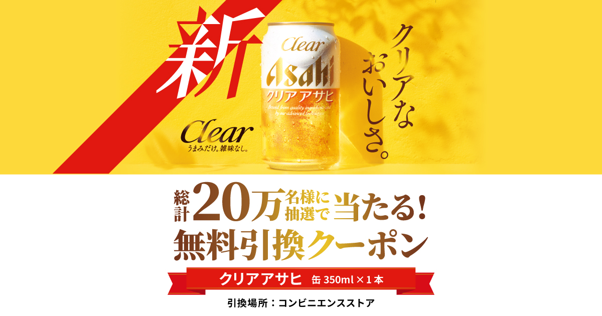 クリア アサヒが200,000名様に当たる!コンビニ無料引換えクーポンプレゼントキャンペーン 詳細
