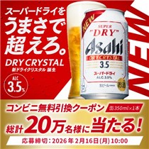 2026年2月16日(月)10時までのキャンペーン期間内に、特設ページにアクセスをした上で応募ボタンからアンケートに回答して動画を視聴して応募をすると、その場で抽選で200,000名に『アサヒスーパードライ ドライクリスタル 350ml缶 コンビニ無料引換券』が当たる、プレゼントキャンペーンとなっています。