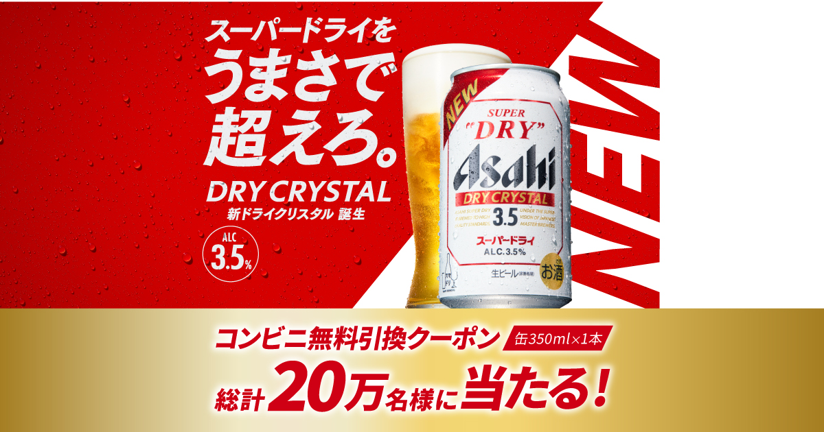コンビニで『アサヒスーパードライ ドライクリスタル』と無料引換えできるクーポンを200,000名様にプレゼントします!