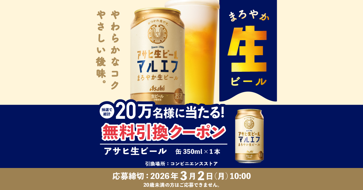 2026年3月2日(月)10時までのキャンペーン期間内に、特設ページにアクセスをした上で応募ボタンからアンケートに回答して動画を視聴して応募をすると、その場で抽選で200,000名に『アサヒ生ビール マルエフ 350ml缶 コンビニ無料引換券』が当たる、プレゼントキャンペーンとなっています。