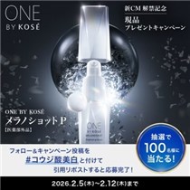 2026年2月12日(木)までのキャンペーン期間内に、公式アカウントをフォローして、キャンペーン対象ポストにハッシュタグ【#コウジ酸美白】を付けて引用ポストすると、後日抽選で100名に『ONE BY KOSÉ メラノショットP 現品』が当たる、プレゼントキャンペーンとなっています。