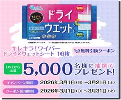 2026年3月21日(土)までのキャンペーン期間内に、公式LINEアカウントを友だちに追加した上で、トーク画面のリッチメニューからバナーをタップして応募をすると、その場で抽選で5,000名に『キレキラ!ワイパー ドライ×ウエットシート16枚 サンドラッグ無料引換券』が当たる、プレゼントキャンペーンとなっています。