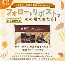 終了済みキャンペーン・懸賞フォロー&RTで300名に『セブンカフェ カカオ香るくちどけ濃厚ガトーショコラ セブンイレブン無料引換券』がその場で当たる!2025年10月【第一生命・X(Twitter)キャンペーン】 保険会社大手の【第一生命】公式X (Twitter)アカウントで「ミラシル 秋のご褒美キャンペーン」が開始しています。 2025年10月12日(日)までのキャンペーン期間中に、公式アカウントをフォローして、キャンペーン期間中に毎日投稿...2025/10/03 [6:50]終了済みキャンペーン・懸賞