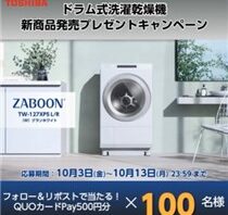 終了済みキャンペーン・懸賞フォロー&RTで100名に『QUOカードPay 500円分』が当たる!2025年10月【東芝ライフスタイル・X(Twitter)キャンペーン】 生活家電製品などを製造・販売している東芝の【東芝ライフスタイル】公式X (Twitter)アカウントで「東芝ドラム式洗濯乾燥機新型発売プレゼントキャンペーン」が開始しています。 2025年10月13日(月)までのキャンペーン期間内に、...2025/10/04 [6:50]終了済みキャンペーン・懸賞