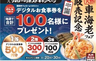 天丼・天ぷら本舗の【さん天】の公式X (Twitter)アカウントで「天然車海老フェア販売記念 プレゼントキャンペーン」が実施中です。 2025年11月30日(日)までのキャンペーン期間内に、公式アカウントをフォローして、キャンペーン期間...