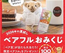 珈琲チェーン店舗を全国展開している【タリーズコーヒージャパン】の公式Xアカウントで「今年の運勢を占うベアフルのおみくじ!キャンペーン」が開始しています。2026年1月25日(日)までのキャンペーン期間内に、2つの公式アカウントをフォローして...