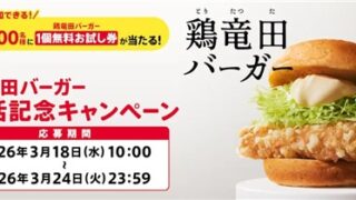 フライドチキン販売チェーン店舗を全国展開する【ケンタッキーフライドチキン】の公式Xアカウントで「鶏竜田バーガー復活記念キャンペーン第1弾」が開始しています。2026年3月24日(火)までのキャンペーン期間内に、公式アカウントをフォローして、...