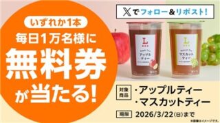 コンビニチェーンストアの【ローソン】の公式Xアカウントで「3月18日(水)スタート♪毎日1万名様に抽選でローソンオリジナルアップルティー・マスカットティー無料券をプレゼント!キャンペーン」が開始しています。2026年3月22日(日)までの期...