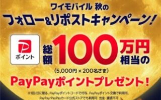 X (Twitter)キャンペーンフォロー&RTで200名に『PayPayポイント 5000円相当』が当たる!2025年9月~10月【ワイモバイル・X(Twitter)キャンペーン】 格安携帯電話会社の【ワイモバイル (Y!mobile)】公式X (Twitter)アカウントで「ワイモバイル 秋のフォロー&リポストキャンペーン!」が開始しています。 2025年10月21日(火)までのキャンペーン期間内に、公式アカウ...2025/09/22 [18:30]X (Twitter)キャンペーンプレゼント・懸賞大量当選(100名以上)毎日応募可能