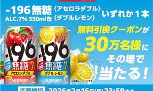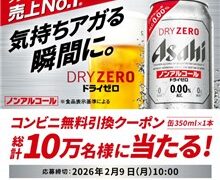 ※20歳未満の方は応募できません。飲料や酒類などを製造販売している【アサヒビール】の公式LINEアカウントで「アサヒドライゼロ が100,000名様に当たる!コンビニ無料引換えクーポンプレゼントキャンペーン」が開始しています。2026年2月...