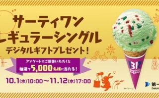 LINEキャンペーンLINE友だちに追加・アンケート回答で5000名に『サーティワン レギュラーシングル ギフト券』が当たる!2025年10月~11月【ミラシル・LINEキャンペーン】 第一生命が運営するミラシルの【第一生命】公式LINEアカウントの特設ページで「第一生命LINE公式アカウント アンケートキャンペーン【2025年10月~11月】」が実施中です。 2025年11月12日(水)17時までのキャンペーン期間...2025/10/08 [6:20]LINEキャンペーンプレゼント・懸賞初回のみ応募可能大量当選(1000名以上)