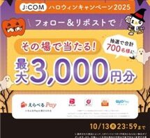 X (Twitter)キャンペーンフォロー&RTで合計700名に『えらべるPay 最大で3000円分』がその場で当たる!2025年10月【J:COM・X(Twitter)キャンペーン】 ケーブルテレビ・インターネット回線サービス提供会社の【J:COM (ジュピターテレコム)】公式X (Twitter)アカウントで「J:COM ハロウィンキャンペーン2025」が開始しています。 2025年10月13日(月)までのキャン...2025/10/07 [17:33]X (Twitter)キャンペーンプレゼント・懸賞初回のみ応募可能大量当選(100名以上)