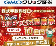 証券会社の【GMOクリック証券】の公式X (Twitter)アカウントで「GMOクリック証券 株式手数料ゼロ&20周年記念キャンペーン」が開始しています。 2025年11月30日(日)までの期間中に、公式X (Twitter)アカウントを...
