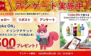 X (Twitter)キャンペーンフォロー&RT&アンケート回答で500名に『CokeONドリンクチケット』が当たる!2025年10月【デジホ・X(Twitter)キャンペーン】 第一生命グループのスマート少額短期保険会社の【デジホ】の公式X (Twitter)アカウントで「500名様に当たる!デジホアンケート2025秋キャンペーン」が開始しています。 2025年10月21日(火)までのキャンペーン期間内に、公...2025/10/10 [6:30]X (Twitter)キャンペーンプレゼント・懸賞初回のみ応募可能大量当選(100名以上)