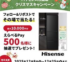 X (Twitter)キャンペーンフォロー&RTで合計500名に『えらべるPay 100円 ~ 1万円分』がその場で当たる!2025年12月【ハイセンス・X(Twitter)キャンペーン】