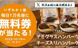 X (Twitter)キャンペーンフォロー&RTで5万名に『ローソン デミグラスハンバーグ or チーズ入りハンバーグ 無料引換券』がその場で当たる!2025年10月【ローソン・X(Twitter)キャンペーン】 コンビニチェーン店舗を全国に展開している【ローソン】公式X (Twitter)アカウントで「10月15日スタート♪毎日1万名様に抽選でデミグラスハンバーグ・チーズ入りハンバーグ無料券をプレゼント!キャンペーン」が開始しています。 20...2025/10/15 [18:02]X (Twitter)キャンペーンプレゼント・懸賞大量当選(10000名以上)毎日応募可能