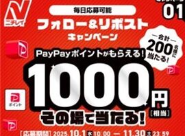 X (Twitter)キャンペーンフォロー&RTで200名に『PayPayポイント 1000円相当』がその場で当たる!2025年10月~11月【ニチレイフーズ・X(Twitter)キャンペーン】 冷凍食品などの販売で有名な【ニチレイフーズ】の公式X (Twitter)アカウントで「ニチレイ秋の大感謝祭!Xキャンペーン」が開始しています。 2025年11月30日(土)までのキャンペーン期間内に、公式アカウントをフォローした上で、...2025/10/03 [7:10]X (Twitter)キャンペーンプレゼント・懸賞大量当選(100名以上)毎日応募可能