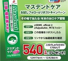 X (Twitter)キャンペーンフォロー&RTで540名に『富士薬品ドラッグストア マスデント ケア 無料引換券』がその場で当たる!2025年12月【セイムス・X(Twitter)キャンペーン】