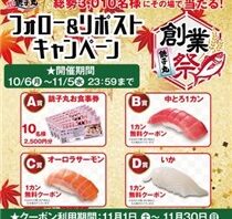 X (Twitter)キャンペーン【地域限定】フォロー&RTで合計3000名に『すし銚子丸 中とろ or オーロラサーモン or えんがわ 1カン無料クーポン』などがその場で当たる!2025年10月【すし銚子丸・X(Twitter)キャンペーン】 東京都・千葉県・埼玉県・神奈川県で店舗を展開する【すし銚子丸】公式X (Twitter)アカウントで「すし銚子丸 創業祭キャンペーン」が開始しています。 2025年11月5日(水)までのキャンペーン期間中に、公式アカウントをフォローし...2025/10/06 [18:13]X (Twitter)キャンペーンプレゼント・懸賞大量当選(1000名以上)毎日応募可能