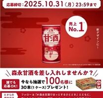X (Twitter)キャンペーンフォロー&引用RTで100名に『森永甘酒 30本 1ケース』が当たる!2025年10月【森永・X(Twitter)キャンペーン】 お菓子などの販売で有名な森永の【森永製菓】の公式X (Twitter)アカウントで「甘酒 差し入れキャンペーン」が実施中です。 2025年5月19日(月)までのキャンペーン期間内に、公式アカウントをフォローして、キャンペーン対象ポスト...2025/10/06 [6:50]X (Twitter)キャンペーンプレゼント・懸賞初回のみ応募可能大量当選(100名以上)