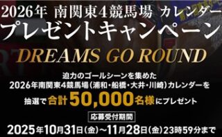 Web応募アンケートに回答・応募で5万名に『2026年 南関東4競馬場カレンダー DREAMS GO ROUND』が当たる!【一般社団法人関東地方公営競馬協議会・Web応募】 ※20歳未満の方は応募が出来ません。 関東地方競馬の団体の【一般社団法人関東地方公営競馬協議会】の公式サイトの特設ページで毎年恒例となっている「2026年 南関東4競馬場カレンダー プレゼントキャンペーン」が実施中です。 2025年11...2025/11/09 [6:00]Web応募プレゼント・懸賞初回のみ応募可能大量当選(10000名以上)