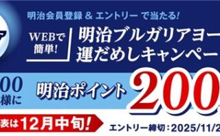 Web応募明治会員IDでエントリーで5000名に『セブンイレブン 明治商品無料引換券と交換できるポイント 200P』が当たる!2025年10月~11月【明治・Web応募】 お菓子を製造販売している【明治】の公式サイトで「明治ブルガリアヨーグルトWEBで簡単運試しキャンペーン」が実施中です。 2025年11月28日(金)までのキャンペーン期間内に特設ページにアクセスをして、会員登録をしていない人は会員登録をし...2025/10/17 [6:00]Web応募プレゼント・懸賞初回のみ応募可能大量当選(1000名以上)