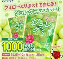 X (Twitter)キャンペーンフォロー&RTで1000名に【ジュレグミ マスカット味 ドラッグストアモリ無料引換券』がその場で当たる!2025年10月【ドラモリ・X(Twitter)キャンペーン】 九州を中心に展開するドラッグストアのドラッグストアモリのキャラクター【ドラモリ】の公式アカウントで「ジュレグミマスカット味 プレゼントキャンペーン」が開始しています。 2025年10月25日(土)までの期間中に、公式アカウントをフォロ...2025/10/16 [17:31]X (Twitter)キャンペーンプレゼント・懸賞初回のみ応募可能地域限定キャンペーン大量当選(1000名以上)