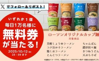 終了済みキャンペーン・懸賞フォロー&RTで5万名に『ローソン オリジナルカップ麺 対象商品 無料引換券』がその場で当たる!2025年10月【ローソン・X(Twitter)キャンペーン】 コンビニチェーン店舗を全国に展開している【ローソン】公式X (Twitter)アカウントで「10月8日スタート♪毎日1万名様に抽選で 対象のローソンオリジナルカップ麺 無料券をプレゼント!キャンペーン」が開始しています。 2025年1...2025/10/08 [18:26]終了済みキャンペーン・懸賞