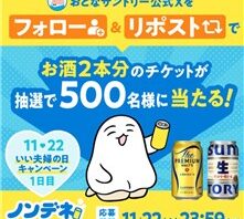 ※20歳未満の方は応募できません。 飲料などの販売で有名なサントリーの【おとなサントリー】の公式X (Twitter)アカウントで「11.22 いい夫婦の日キャンペーン」が開始しています。 2025年11月22日(土)までのキャンペーン...