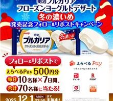 X (Twitter)キャンペーンフォロー&で70名に『えらべるPay 500円分』が当たる!2025年11月【明治ブルガリアヨーグルト・X(Twitter)キャンペーン】