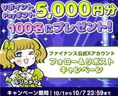 終了済みキャンペーン・懸賞フォロー&RTで100名に『VポイントPayギフト 5000円分』が当たる!2025年10月【三井住友カードファイナンス・X(Twitter)キャンペーン】 クレジットカード会社の三井住友カードのファイナンス情報を発信している【三井住友カード ファイナンスサービス】の公式X (Twitter)アカウントで「ルリちゃんからのプレゼントキャンペーン」が実施中です。 2025年10月7日(火)ま...2025/10/05 [11:39]終了済みキャンペーン・懸賞